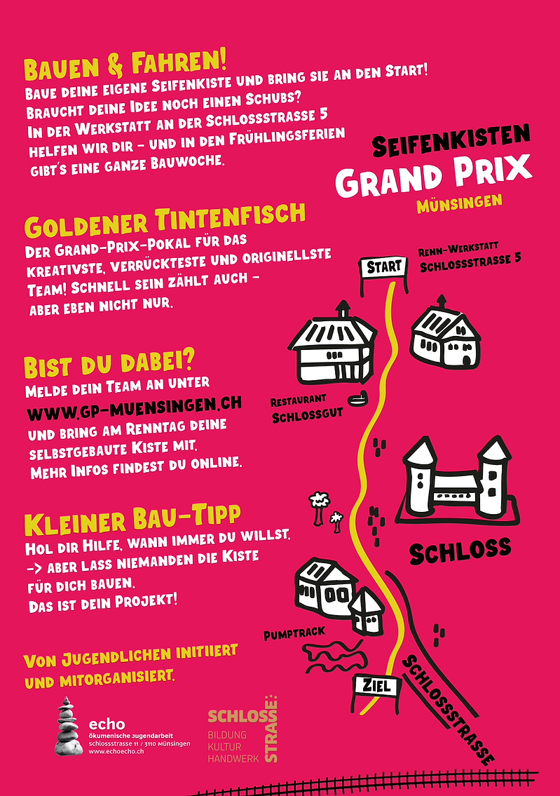 Du hast auch die Möglichkeit, in die Bauwoche während den Frühlingsferien vom 15. - 18. April zu uns an die Schlossstrasse 5 zu kommen, um an deiner Seifenkiste zu tüfteln. Anmelden für die Bauwoche: https://gp-muensingen.ch/anmeldung-bauwoche/